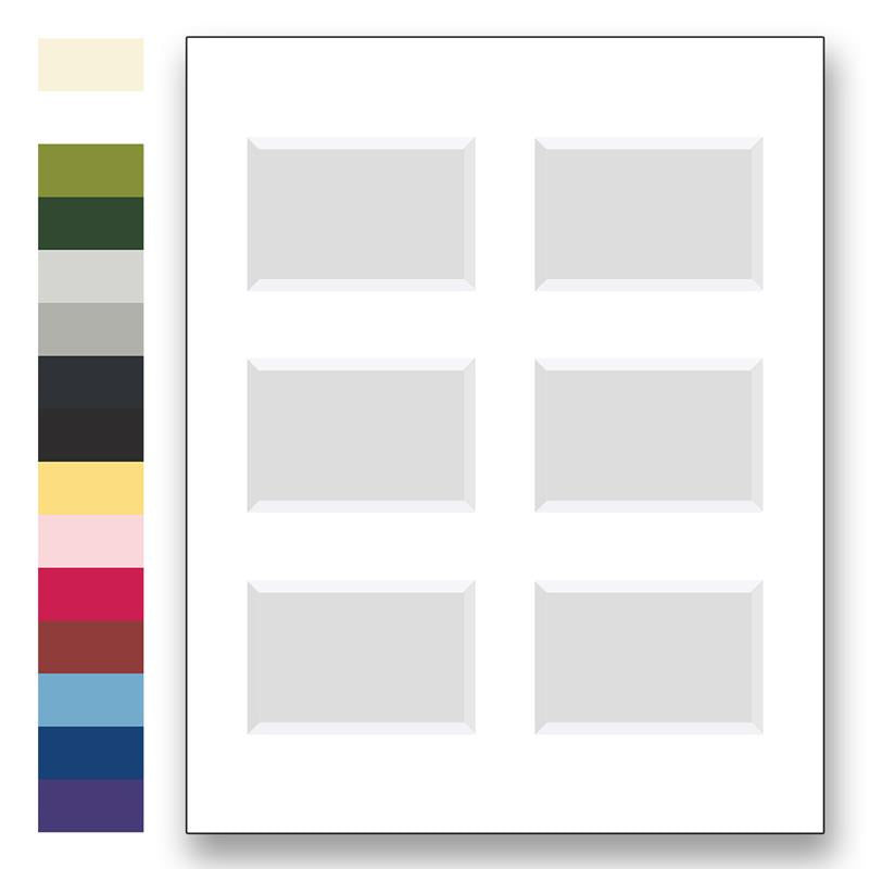 This 6 opening mat will fit into almost any 16x20" picture frame. The windows in the mat can be used to display 6 pictures that are 3"x3", 3.5"x5, 4"x4", 4"x6" or 5"x5" in size. Choose from a variety of mat colors including white, cream, grays, black, chrome, yellow, pink, reds, greens, blues and plum. Includes a foam board backing.