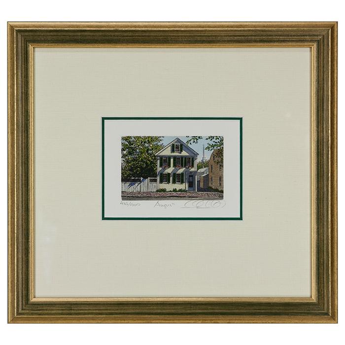 Description: Limited edition hand colored etching framed in a 1 3/8" wide green and gold wood frame with U.V. filtering glass and fabric top double mat.