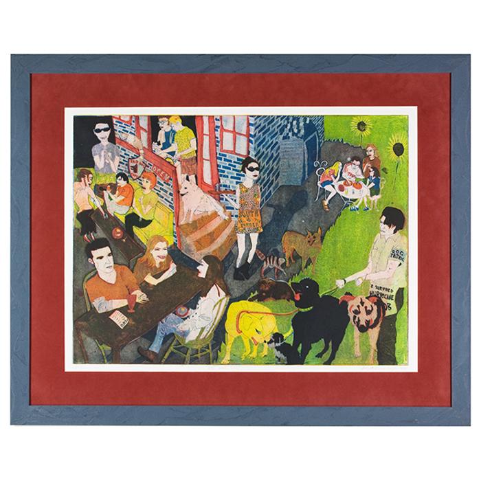 Limited edition lithograph (5/6) framed in a 1 3/8" wide blue/gray stucco wood frame with U.V. filtering glass and a suede fabric mat.