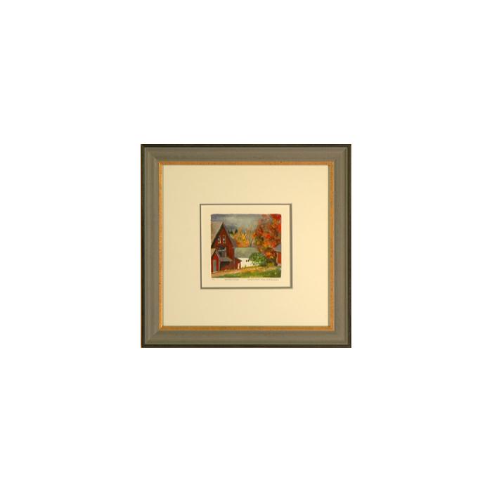 Description: Monoprint framed in a 1 1/4" light blue frame with a gold lip. Framed with U.V. filtering glass and a double acid free mat.