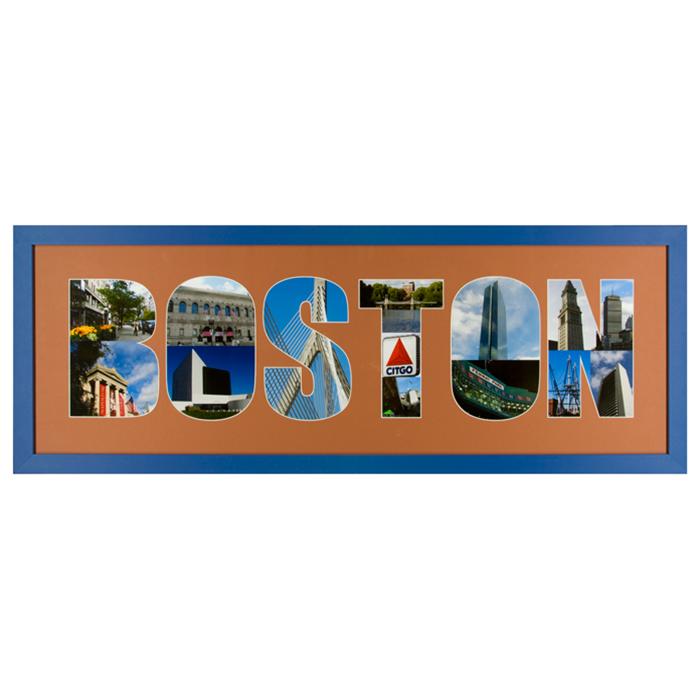 Description: Photographs by Kurt Neumann framed in a 1" wide blue painted wood frame. Framing features a U.V. filtering glass and acid free mat with the letters of the collage cut in it.