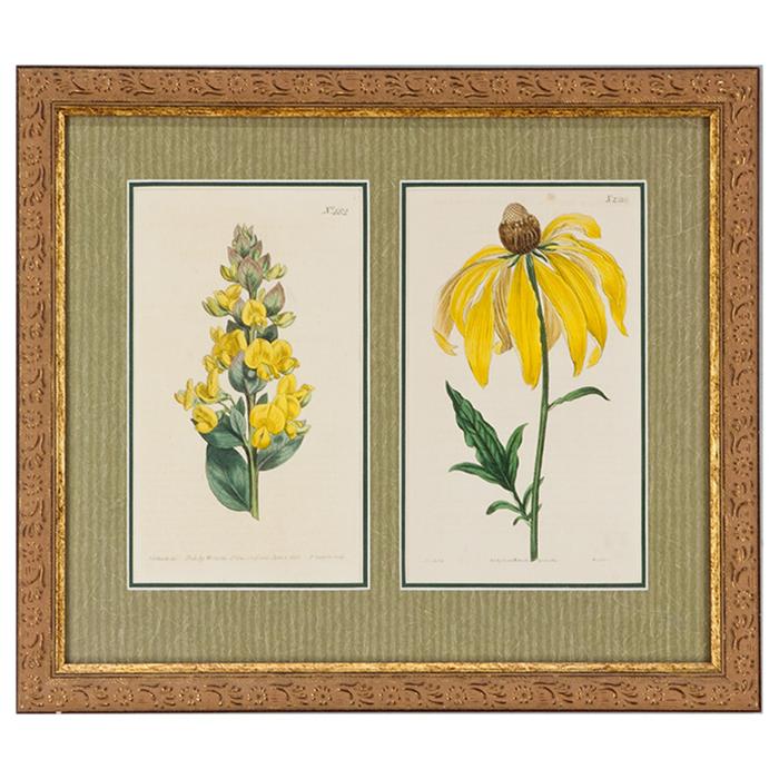 Two old book page images framed in a 1" wide traditional deco gold wood frame with U.V. filtering glass and features a rice paper covered top mat and green bottom mat.