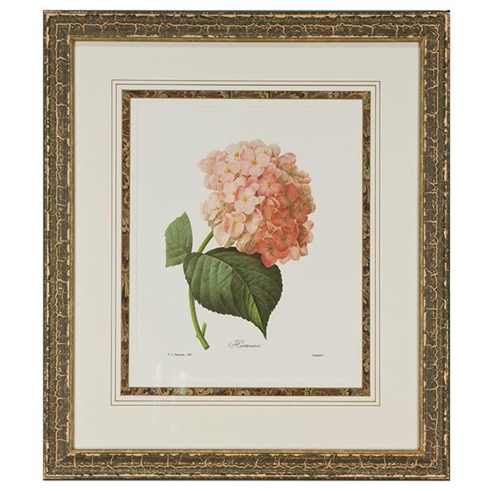 Reproduction of old botanical framed in a 1 1/2" wide distressed green and gold wood frame with U.V. filtering glass and an acid free white mat with a marbleized paper stripe and 4 gold french lines on the mat.