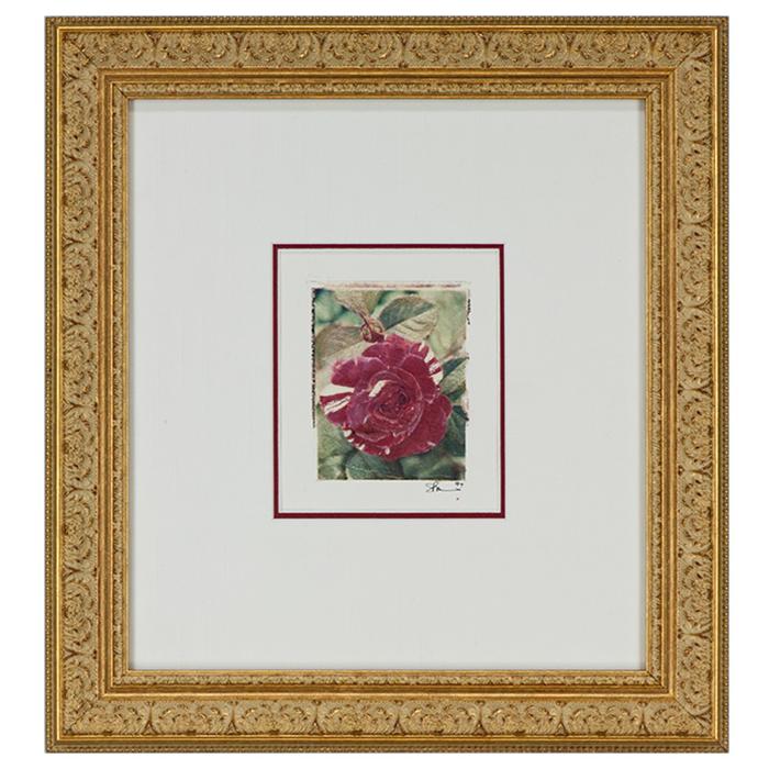 Signed mono-print floral image framed in a 1 5/8" wide traditional decorative gold wood frame with U.V. filtering glass and a double acid free fabric mat.