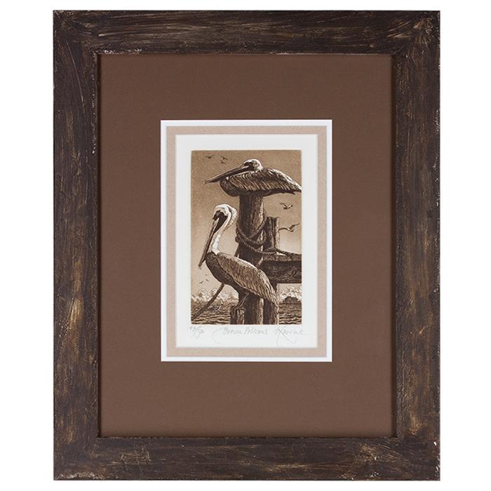 Description: Hand colored etching limited edition (193/500) framed in a 1 3/8" wide dark brown painted distressed wood frame with regular glass and a triple acid free mat.