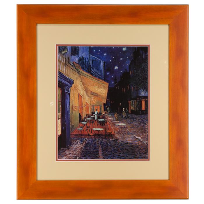 Description: Offset lithograph print of Van Gogh painting framed in a 2 1/2" wide honey wood frame with regular glass and a double acid free mat.