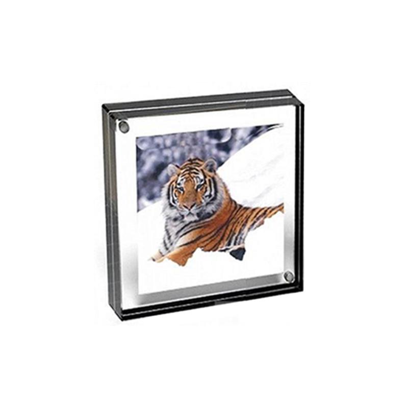 The Metallic Edge Magnet Frame by Canetti is made of two panels of solid, clear acrylic, attached by tiny magnet points. Acrylic panels are 7/16" thick, which makes a ⅞" thick block when put together. Frame edges are tinted with opaque silver color. This frame can hold photos as large as 4" x 6".