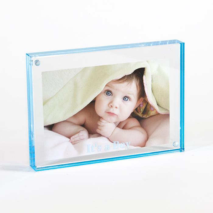 The "It's A Boy!" Pastel Color Edge Magnet Frame, by Canetti, bears the laser-engraved message across the bottom of the frame. Made of two thick panels of clear, solid acrylic which are held together by tiny magnet points, the picture is very easily placed between the two panels and is held securely with no additional hardware. Presented this way, the picture stands out clearly on its own, without a cumbersome frame around it. This frame can hold two pictures back-to-back, up to 5" x 7". The sides of the frame are tinted in a translucent aqua. Please select whether you will be using a horizontal or vertical photo.