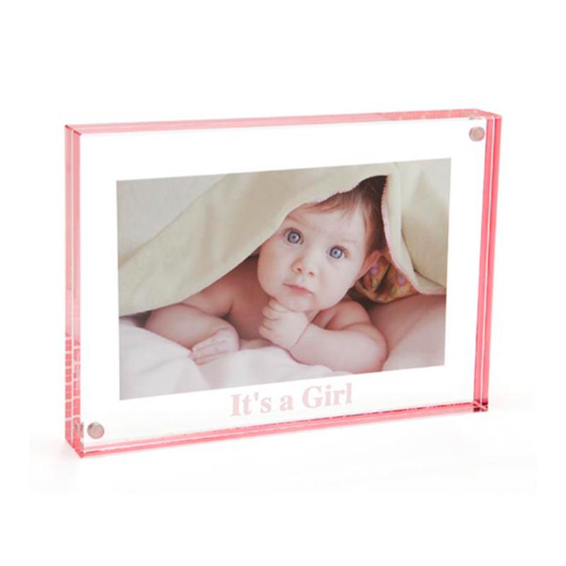 The "It's A Girl!" Pastel Color Edge Magnet Frame, by Canetti, bears the laser-engraved baby announcement "It's A Girl!" across the bottom of the frame. Made of two thick panels of clear, solid acrylic which are held together by tiny magnet points, the picture is very easily placed between the two panels and is held securely with no additional hardware. Presented this way, the picture stands out clearly on its own, without a cumbersome frame around it. This frame can hold two pictures back-to-back, up to 5" x 7". The sides of the frame are tinted in a translucent rose. Please select whether you will be using a horizontal or vertical photo.This frame is also available with a aqua-colored edge and the message "It's a Boy!"