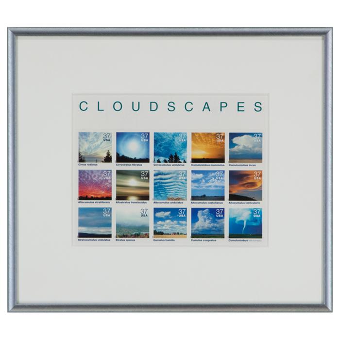 Description: 20 original U.S. postage stamps of clouds framed in a 1/4" wide florentine silver metal frame with U.V. filtering glass and a single mat.