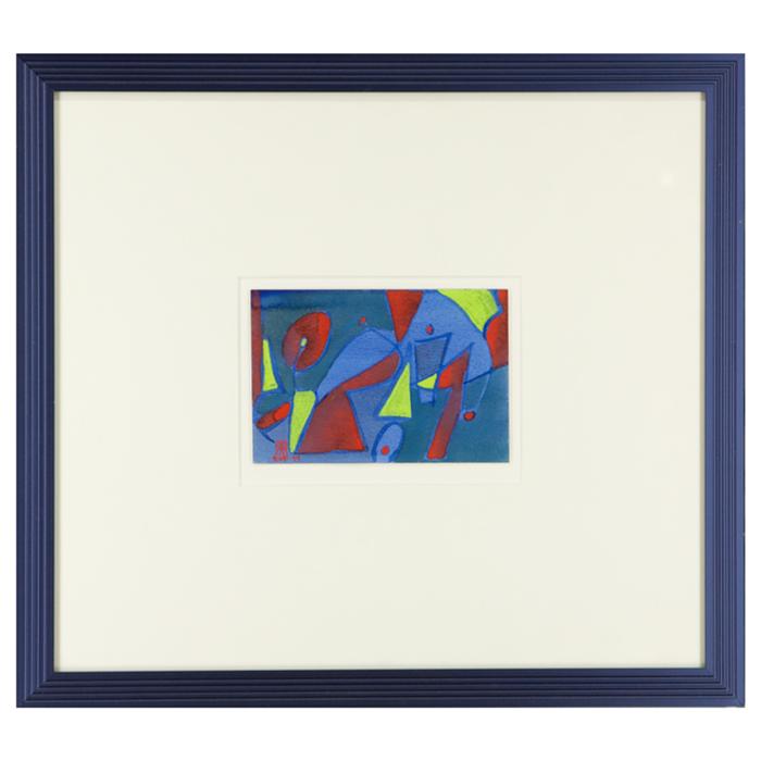 Description: Original painting on paper framed in a 7/8" wide ridged blue metal frame. Art is floated on one mat layer and them matted with a second mat. Frame also has regular glass.