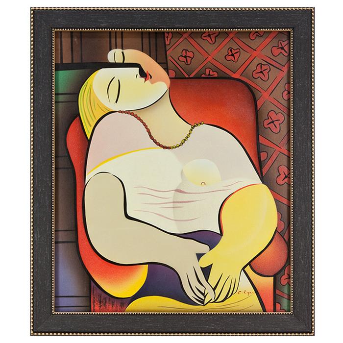 Description: Mixed media framed in a 2" wide black with gold beads on the edges wood frame with U.V. filtering glass.