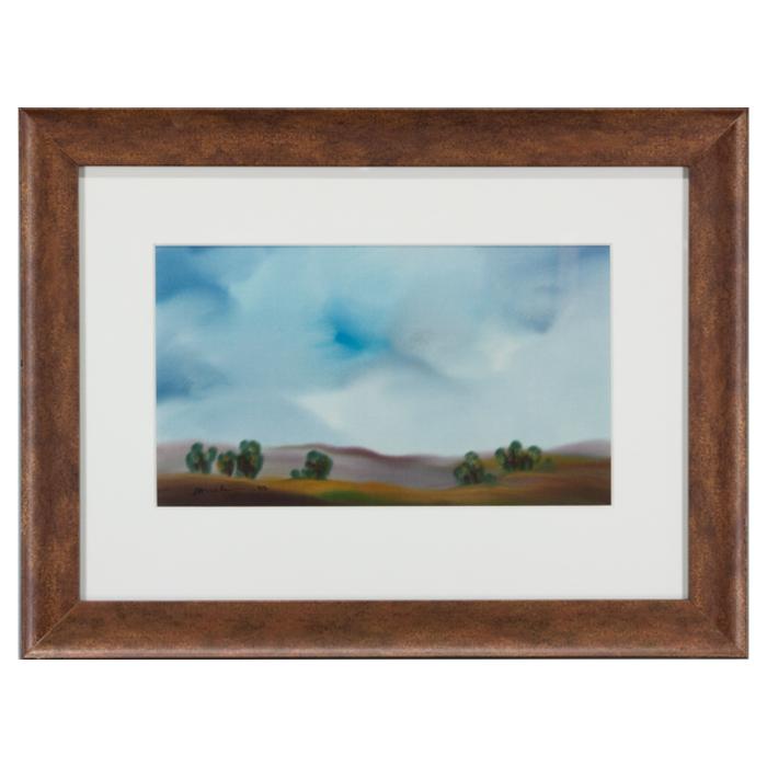 Description: Giclee image framed in a 1 3/4" wide sloped bronze and black wood frame with U.V. filtering glass and a single 8-ply thick acid free mat.