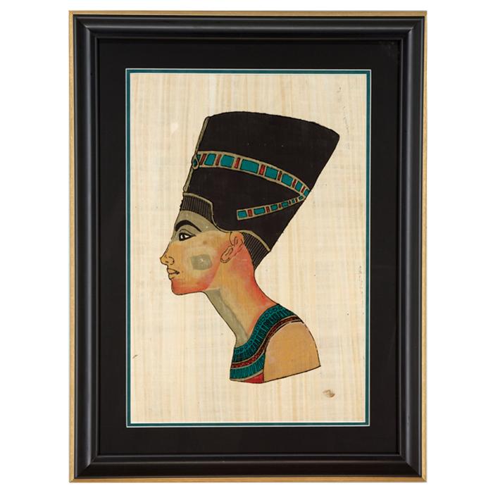 Description: Painting on papyrus framed in a 1 7/8" wide black with gold outside edge frame with regular glass and a double acid free mat.