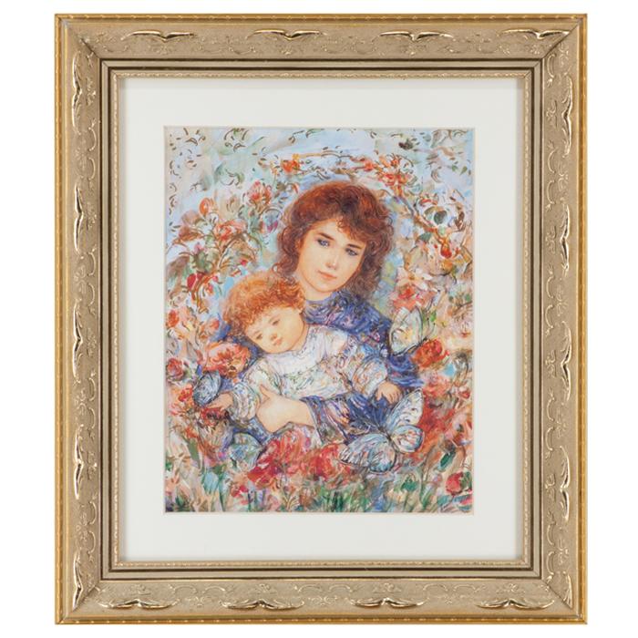 Description: Offset lithograph print with gold embellishments framed in a 1 3/4" wide deco style gold with regular glass and a single mat.
