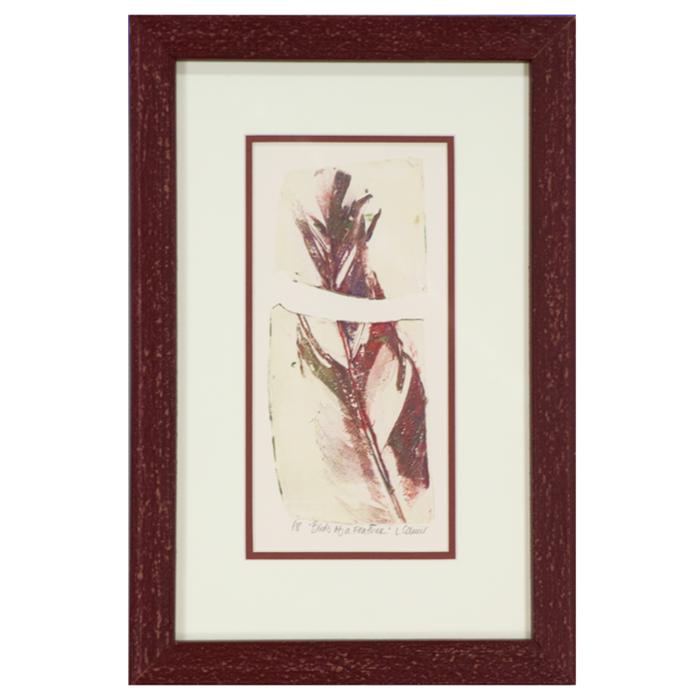 Monoprint framed in a 1" wide distressed burgundy painted wood frame with U.V. filtering glass and a double mat.