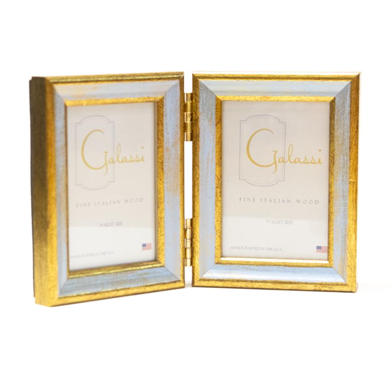 - This F.G. Galassi 2.5 x 3.5 hinged double picture frame features a gentle inward curved moulding with an antiqued bright gold color that includes a brushed powder blue center panel on the front. Frame looks great with photos and images that have golden color tones or subtle blue images. Frame also is ideal as a baby gift due to the subtle powder blue accent color. This ready made picture frame will fit two 2 1/2 x 3 1/3" photos, images or artwork.