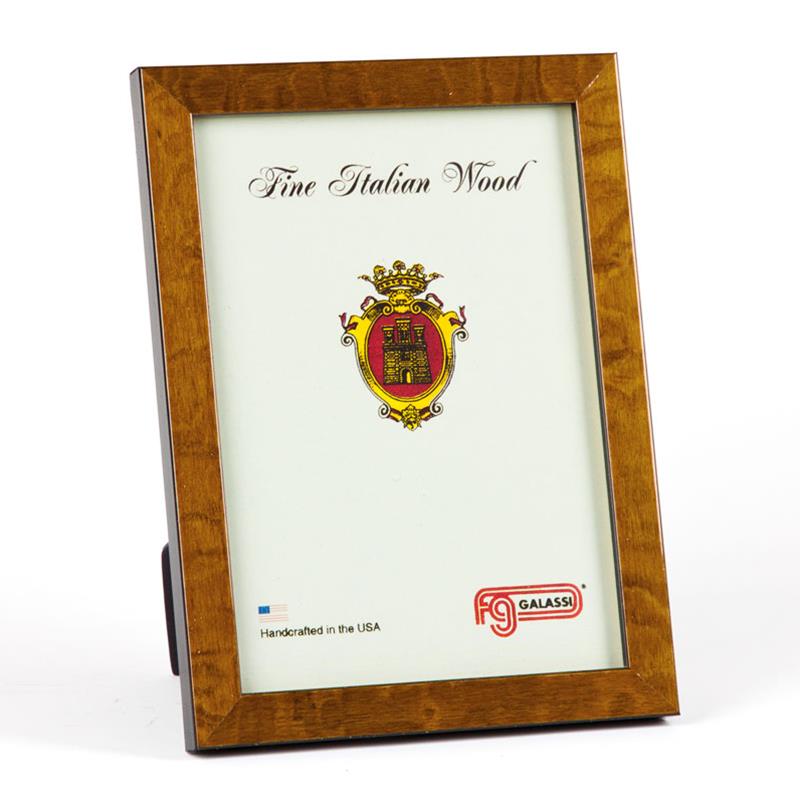 - This F.G. Galassi ready made frame features a glossy chestnut colored burl wood veneer layered over a wood frame. The inner and outer edges of frame are also painted black for a contemporary look. The beauty and richness of burl wood comes from its natural variations in grain patterns so each frame will have its own distinct look and character. Frame will fit a 3 1/2”x5” photo or image.