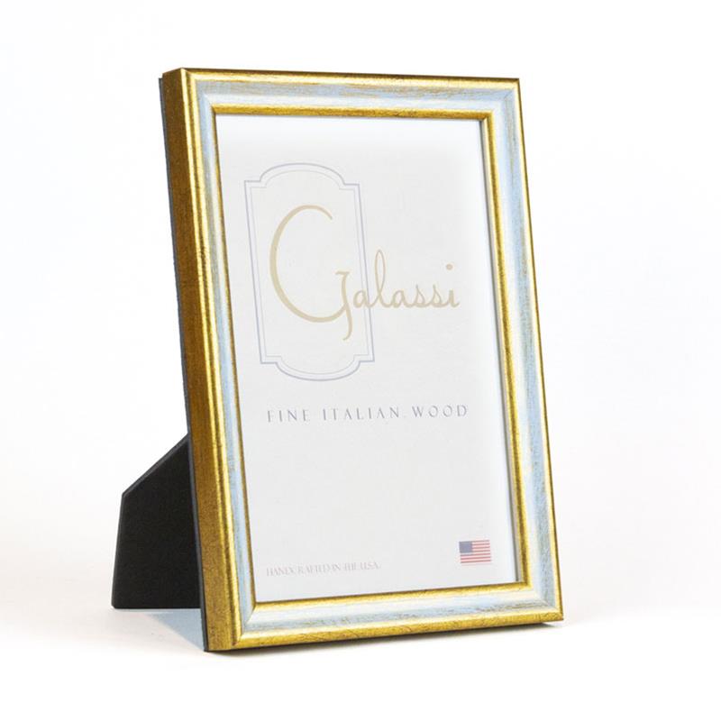 - This F.G. Galassi 4x6 picture frame features a gentle inward curved moulding with an antiqued bright gold color that includes a brushed powder blue center panel on the front. Frame looks great with photos and images that have golden color tones or subtle blue images. Frame also is ideal as a baby gift due to the subtle powder blue accent color. This ready made picture frame will fit a 4" x 6" photo, image or artwork.
