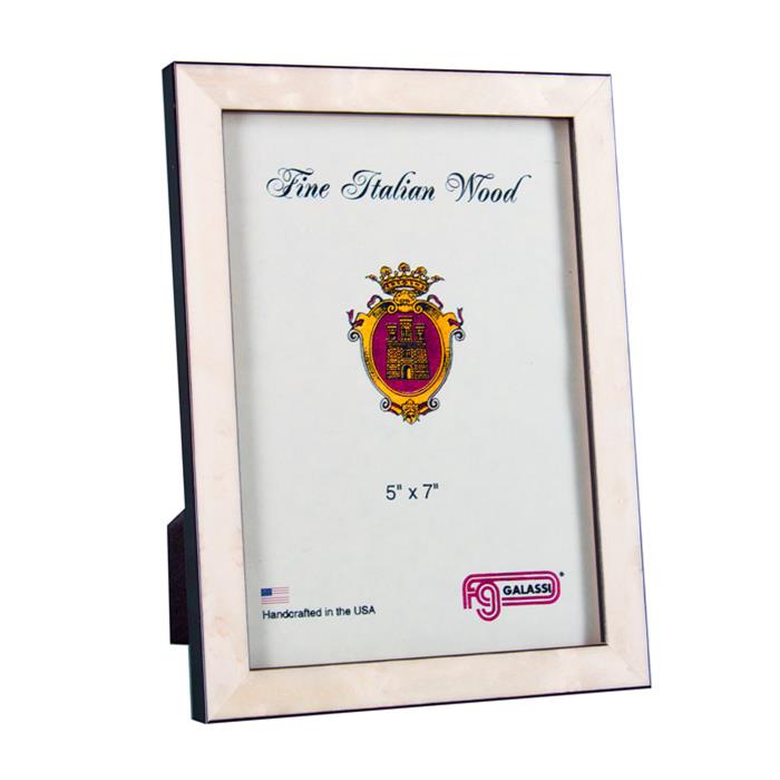 This F.G. Galassi frame features a glossy ivory colored burl wood veneer layered over a wood frame. The inner and outer edges of frame are also painted black for a contemporary look. The beauty and richness of burl wood comes from its natural variations in grain patterns so each frame will have its own distinct look and character. Frame comes with an easel back and can stand vertical or horizontal.