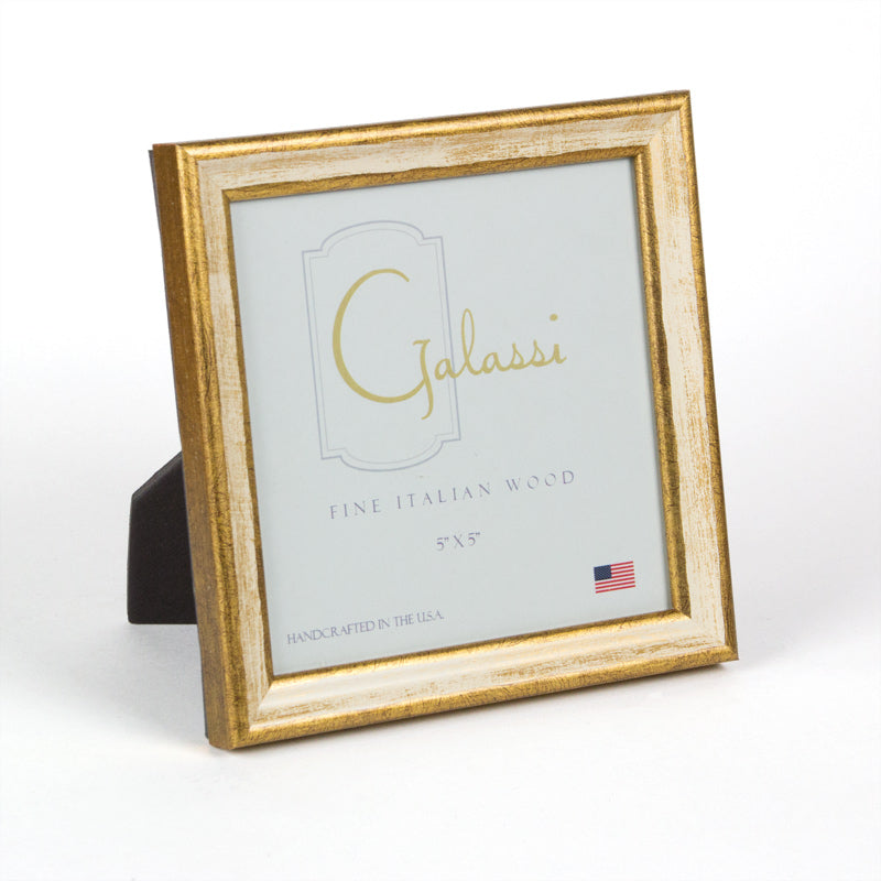 - This F.G. Galassi frame is made of wood and features an antiqued gold finish with a light white color rub which enhances images that have gold or white in them. Frame will fit a 5 x 5" image or photo.