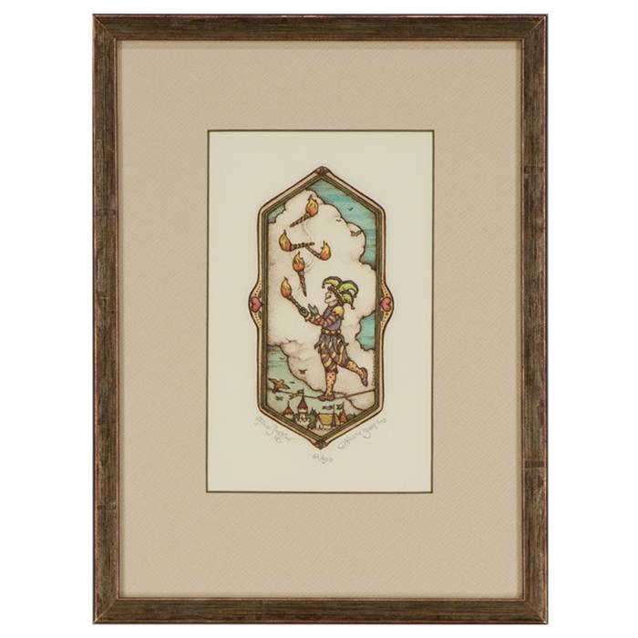 Description: Original etching framed in a 1/2" weathered gold wood frame with U.V. filtering glass and a double mat.