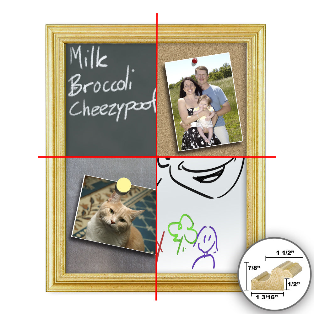 - This is one of the ready-made picture frames we make here at Frame It / Waban Gallery. Our 18x24" memo board frame is made out of solid real wood and features an elegant reverse cove profile with decorative ridges and a warm, bright leafed gold finish. This gold wood 18x24" framed memo board is both stylish and functional, and works great alongside artwork or photos.