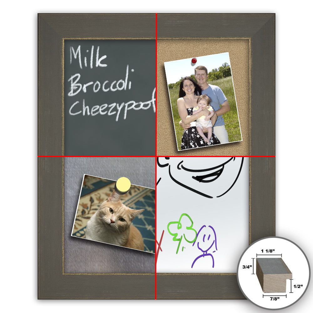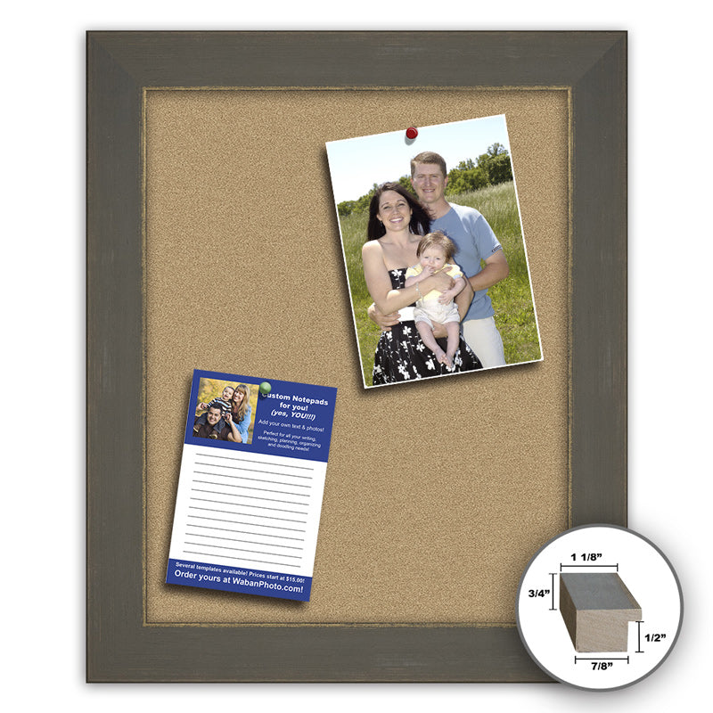 - This is one of the ready-made picture frames we make here at Frame It / Waban Gallery. Our 18x24" memo board frame is made out of solid real wood and features a flat profile and a distressed warm gray finish with a hint of gold along the inner lip. The frame moulding is finished with hand-applied gray and gold leaf for a rich look and feel. This gray and gold wood 18x24" framed memo board is both stylish and functional, and works great alongside artwork or photos.