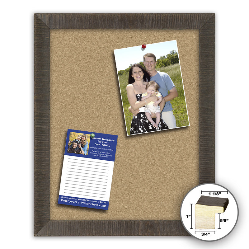 - This is one of the ready-made picture frames we make here at Frame It / Waban Gallery. Our 20x30" memo board frame is made out of solid real wood and features a sloped inward profile with a rustic cross-grain texture evocative of lush tree bark. This rustic ebony wood 20x30" framed memo board is both stylish and functional, and works great alongside artwork or photos.