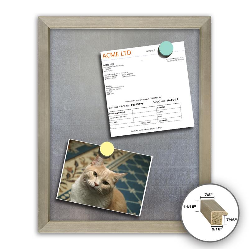 - This is one of the ready-made picture frames we make here at Frame It / Waban Gallery. Our 16x20" memo board frame is made out of solid real wood and features a flat profile and a bright leafed silver finish with a slightly recessed inner lip. The frame moulding is finished with hand-applied silver leaf for a rich look and feel. This silver wood 16x20" framed memo board is both stylish and functional, and works great alongside artwork or photos.