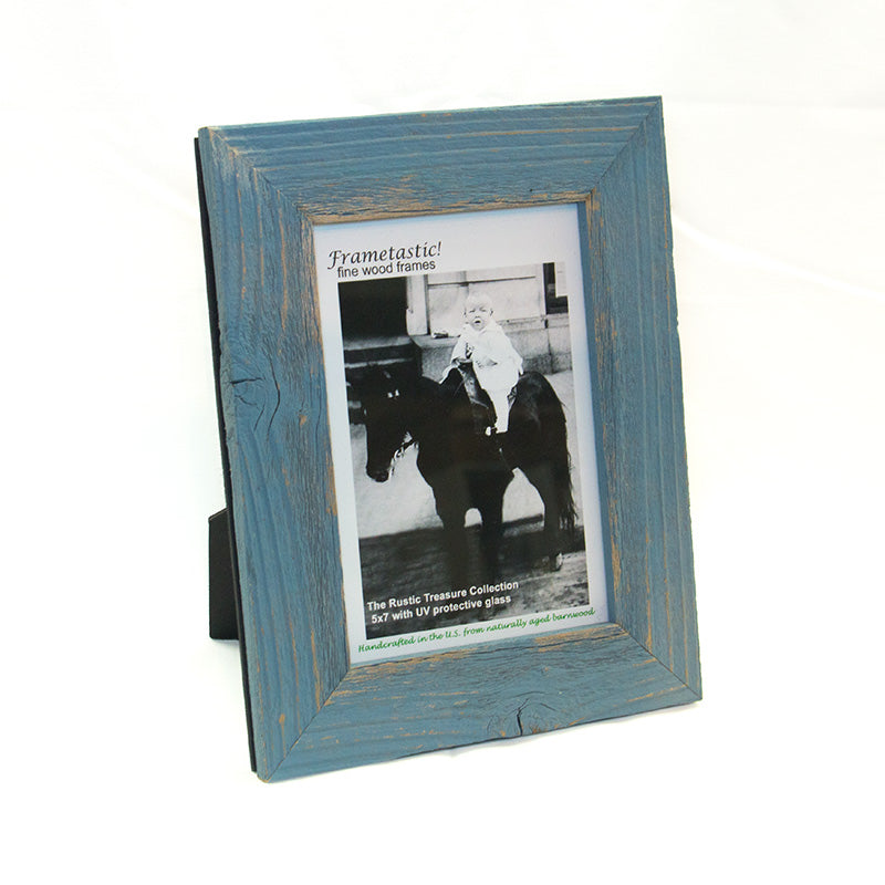 This Frametastic frame features real reclaimed barn board wood that include knots, nail holes and distressing. Frame is also hand painted with a worn light-blue finish so each frame has it's own unique look and feel. Comes with an easel back that can stand horizontal or vertical.