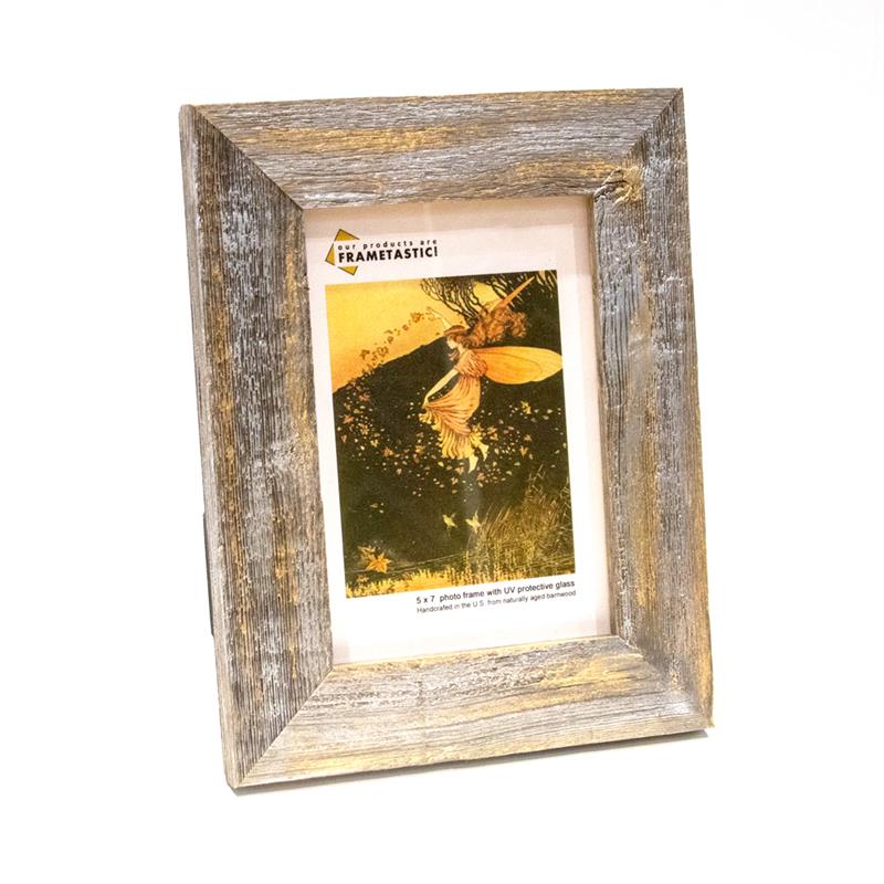 - This frame from the Reimagined Rustic collection features real reclaimed barn board wood, a make-over… After applying a solid color, the wood is then embellished with swirls of silver and/ or gold leaf paint. Frame will fit a 5”x7” photo or image.