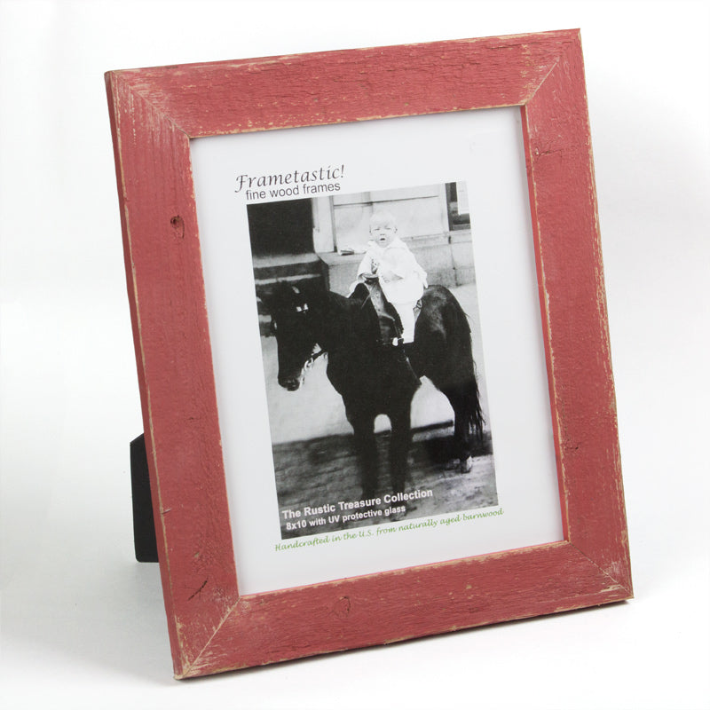 This Frametastic frame features real reclaimed barn board wood that include knots, nail holes and distressing. Frame is also hand painted with a worn brick-red finish so each frame has it's own unique look and feel. Comes with an easel back that can stand horizontal or vertical.