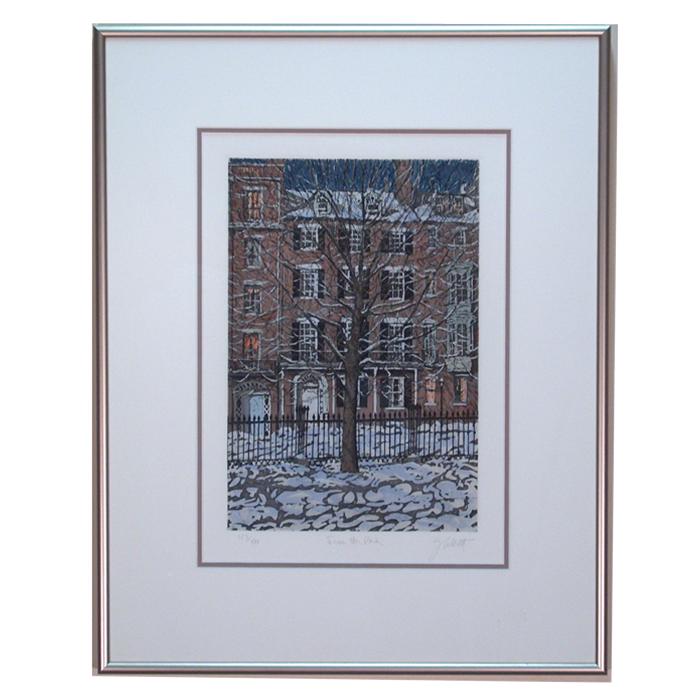 Description: Limited edition hand colored etching (153/400) framed in 3/8" wide blush metal frame with regular glass and a double mat.