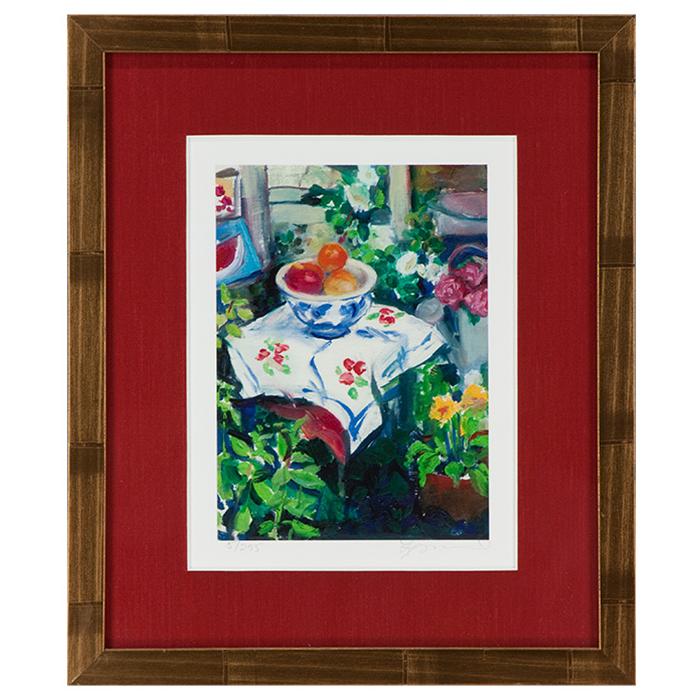 Limited edition framed in a 5/8" wide flat gold wood frame with leafing lines on top and black outside edges. Framed with U.V. filtering glass and a single acid free fabric mat.