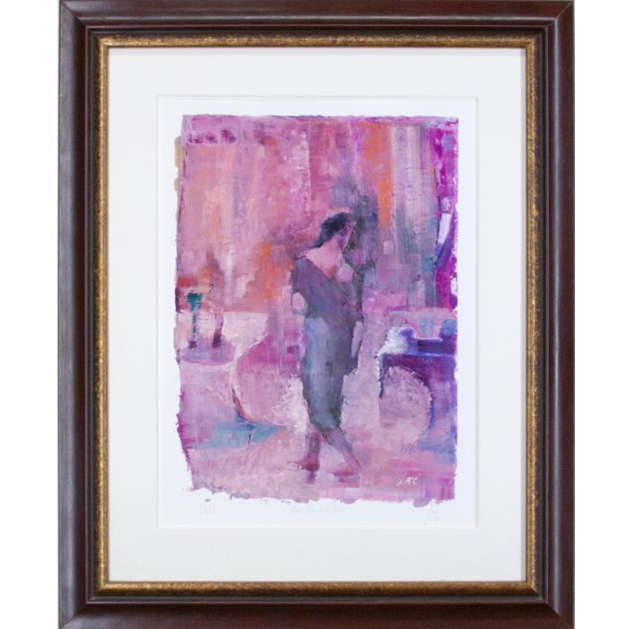 Description: This is a limited edition giclee prine. The picture is framed in a 2 1/4" wide hand waxed red painted wood frame with an antique gold lip on the inside edge. Framing also includes anti glare U.V. Filtering museum glass and has a linen fabric mat.
