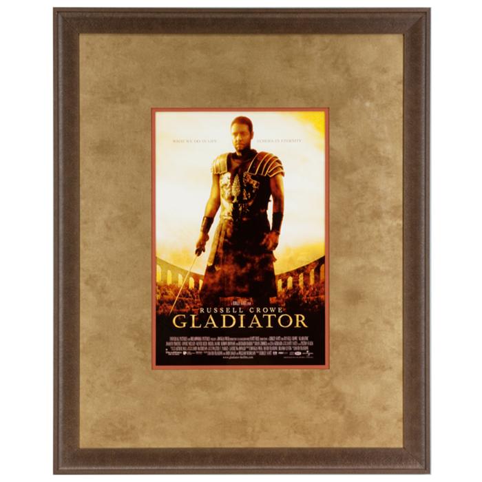 Description - Reproduction print of the movie poster from Gladiator. This picture is framed in a 1 1/2" wide natural bronze metal over aluminum frame. Framing also features U.V. filtering and a acid free aged gold top mat and burnt orange bottom mat.