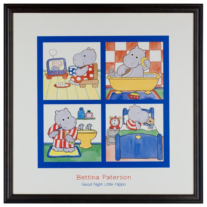 Description: Offset lithograph print frame in a 3/4" dark navy blue stained wood frame with regular glass.