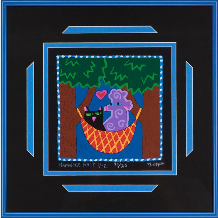 Description: Limited edition serigraph (90/315) with certificate of authenticity framed in a 3/8" wide blue round metal frame with regular glass and an acid free black double mat with cut-outs.