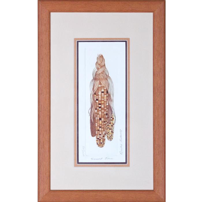 Description: Limited edition 561/1200 hand colored etching. Art is framed in a 7/8" wide slightly rounded thick grained terracotta color wood frame. Frame also includes u.v. filtering glass for protection.