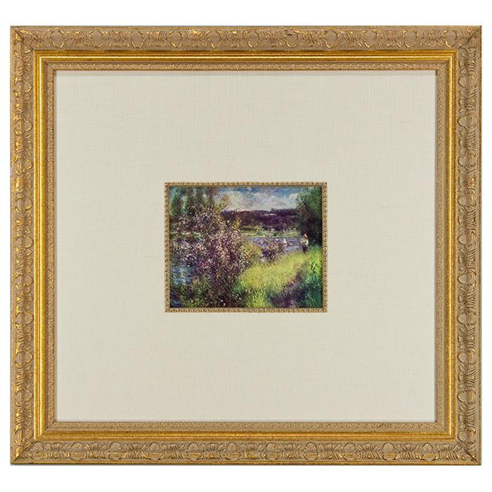 Description: Reproduction print framed in a 2 3/8" wide museum gold frame with regular glass and fabric mat with a decorative gold fillet in the inside edge.