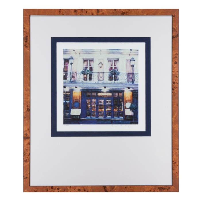 Limited edition print (138/275) framed in a 1" wide painted burl wood frame. Features regular glass and an acid free top mat and a fabric inner mat. Includes certificate of authenticity.