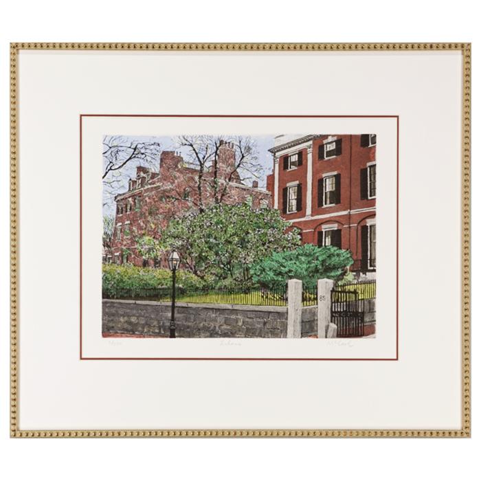 Description: Limited edition hand colored etching (5/250) framed in a 1/4" wide gold beaded metal frame with UV-filtering glass and a double acid free mat.