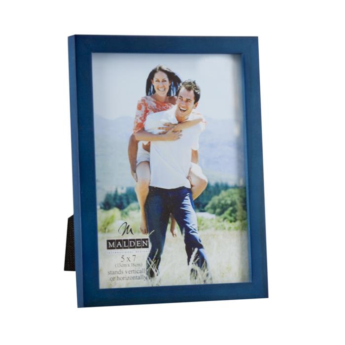 Frame features a painted blue finish. Comes with an easel back that can be hung up or stand horizontal or vertical.