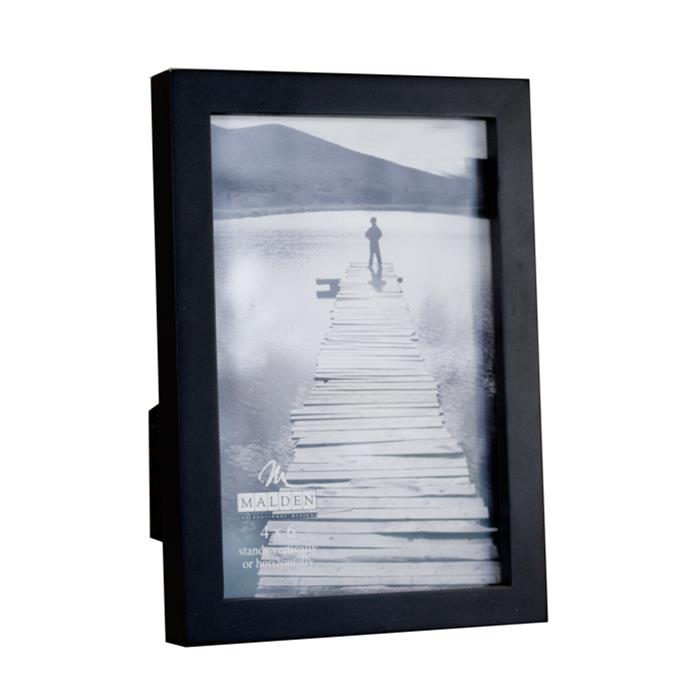 Black painted wood frame includes easel backing for table top display or can be hung on the wall. Frame can stand either horizontal or vertical.