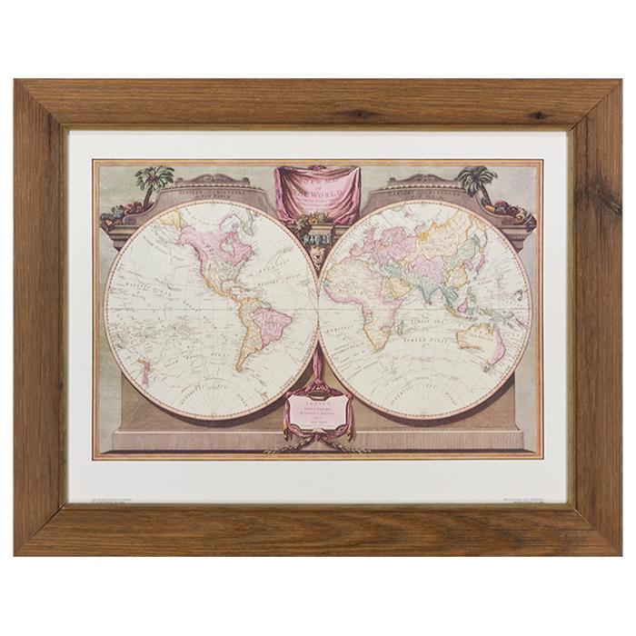 Offset lithograph print of a world map framed in a 2¼" wide brown barn board wood frame with a gold edge with non-glare glass.