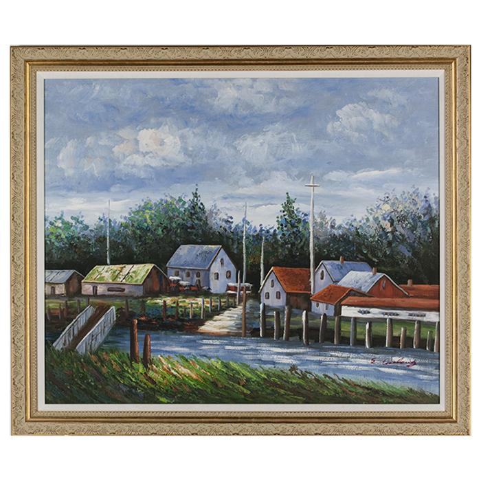 Description: Original painting on canvas framed in a 1 1/2" wide deco gold wood frame with a 3/4" linen liner inner frame.