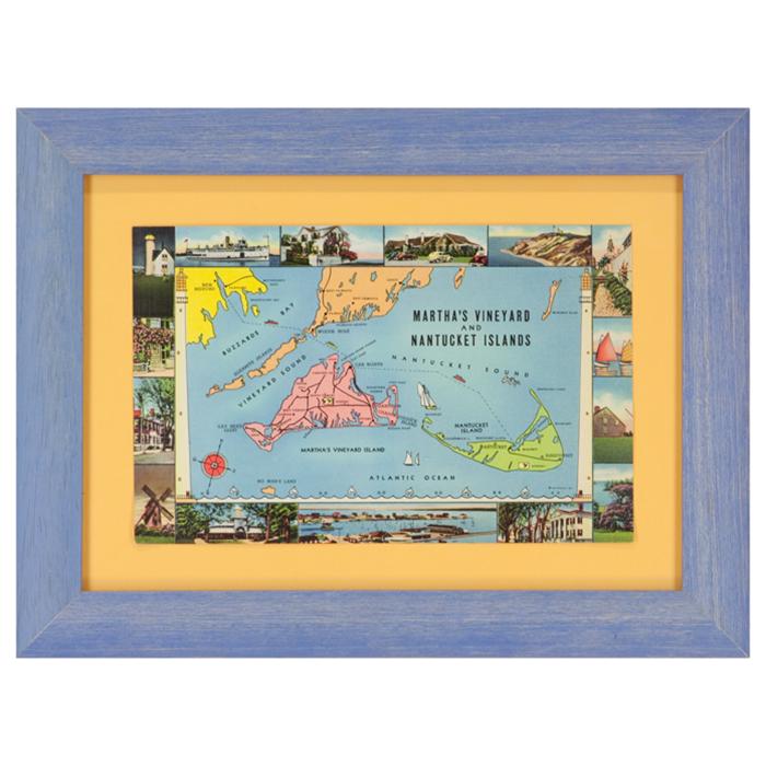 Description: Offset lithograph printed on textured paper float mounted on a yellow mat and framed in a 1 1/2" wide rustic blue grain frame with U.V. filtering glass.