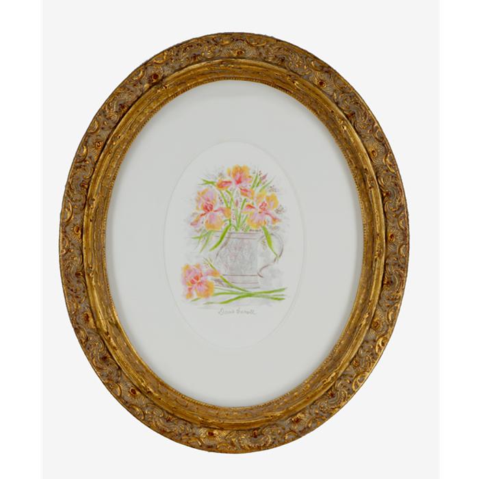 Offset lithograph print framed in a 1 1/4" wide oval, gold embellished frame with regular glass and an acid free oval mat.