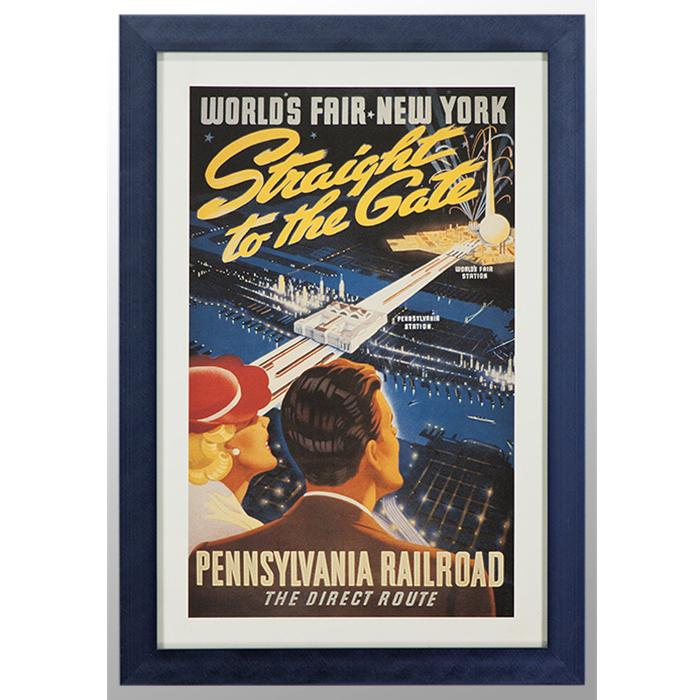 This is an offset lithograph reproduction of a 1939 poster promoting Pennsylvania Railroad service to the New York World's Fair. The picture is framed in a 7/8" wide florentine cobalt blue metal frame. Framing also includes regular glass.